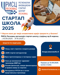 Регионални иновациони стартап центар Лесковац организује стартап школу у трајању од 6 недеља у периоду од 15.09.2025. године до 31.10.2025. године. Заинтересована лица могу се пријавити за стартап школу путем мејла obuke@riscleskovac.rs.